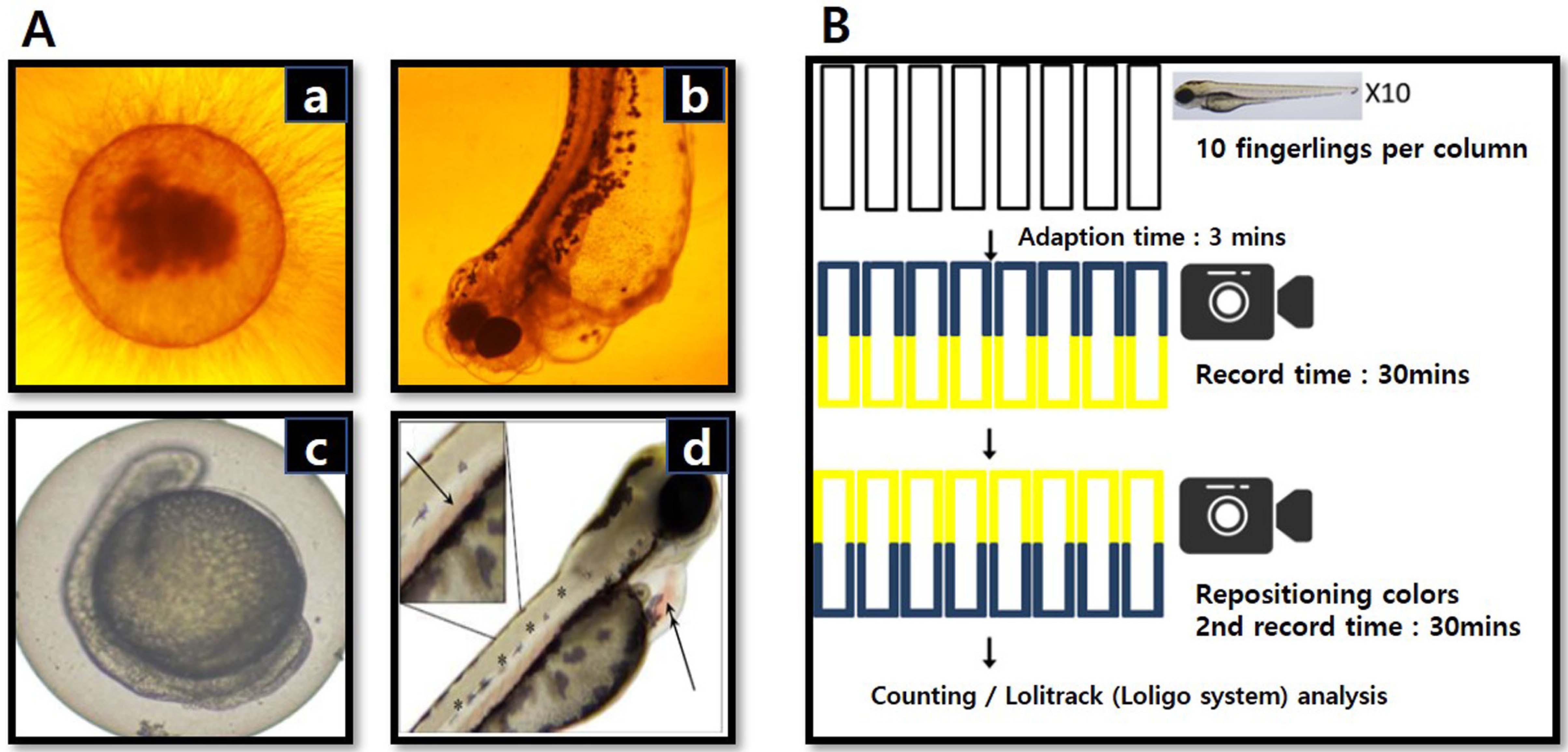 Fig. 1. Lethal dose criterion of zebrafish egg exposure experimental (A), Zebrafish cognition ability and behavior change test model (B)