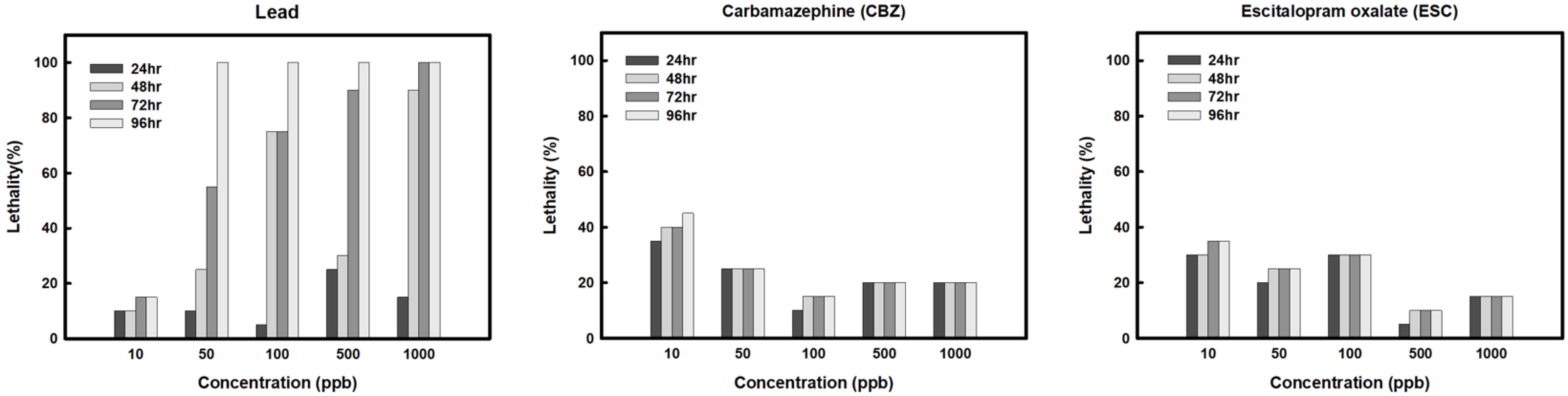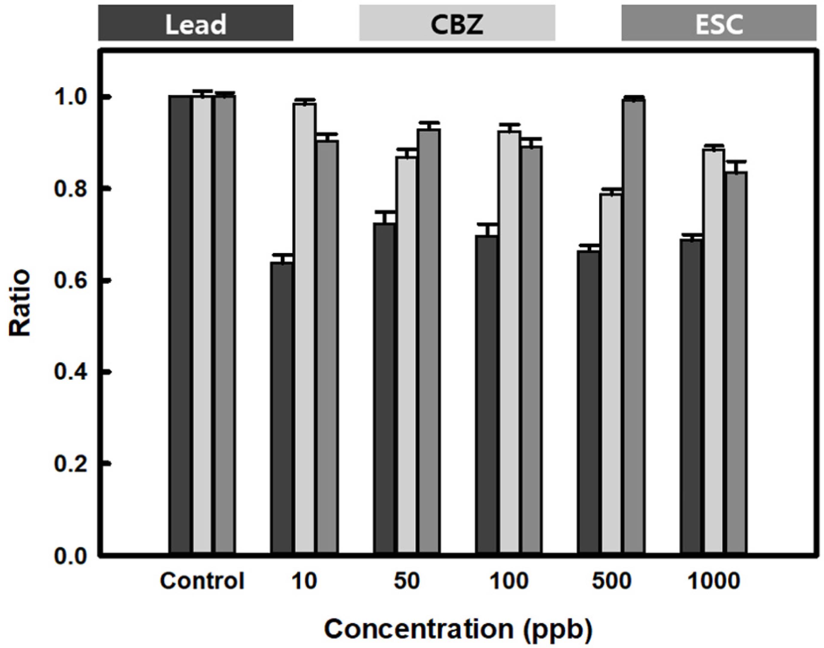 0.1 mg/L를 참고하여 ESC, CBZ 그리고 납의 노출 농도를 10 ppb, 50 ppb, 100 ppb, 500 ppb, 1,000 ppb으로