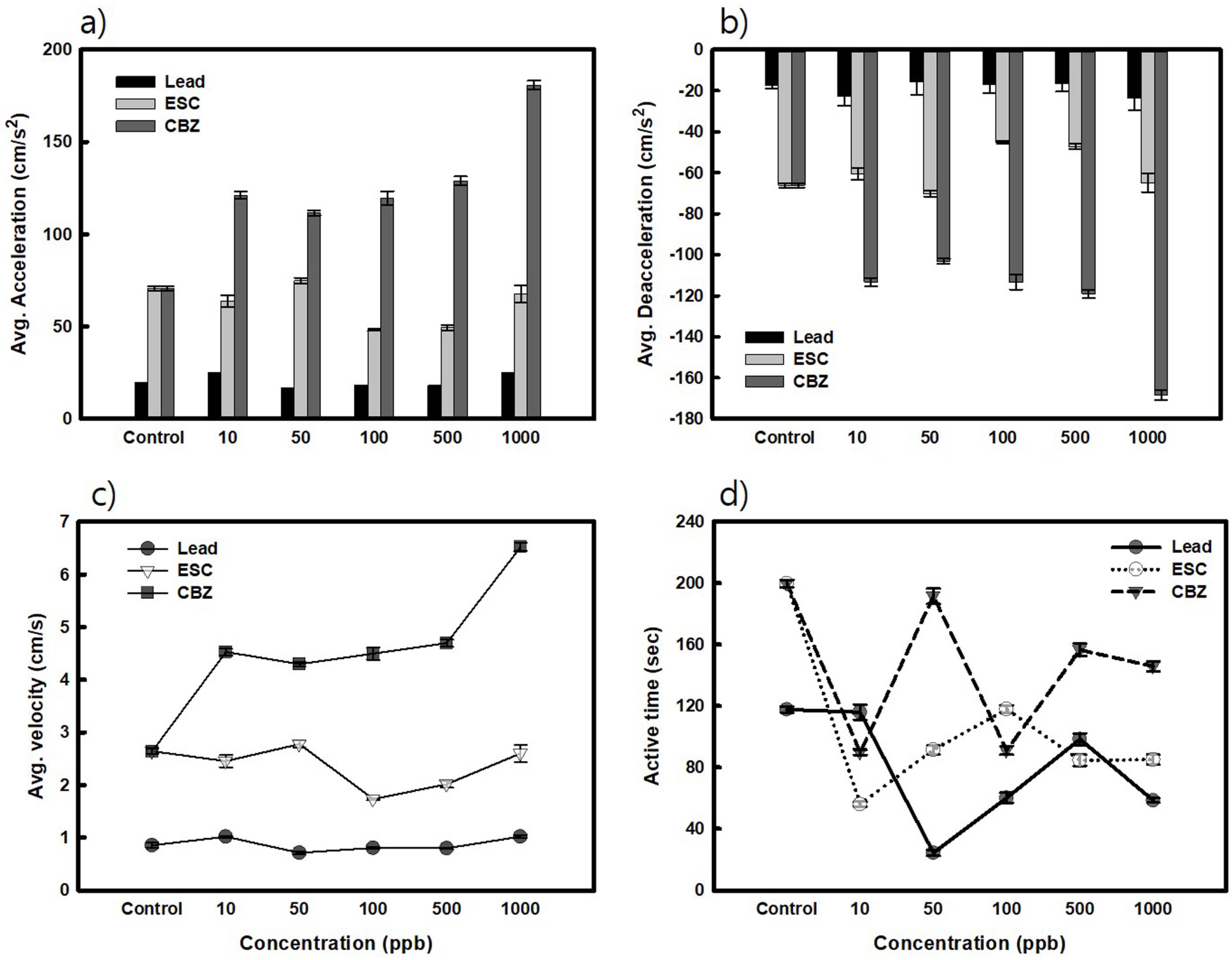 변화(가속도와 감속도의 증가)가 확인되었다 (Fig. 4a, 4b). 평균 속도 결과(Fig. 4c)에서 납 및 ESC는 노 출 농도 증가에 따른 평균 속도의 변화는 확인되기 어려우 나, CBZ는 농도가 높아질수록 유영 속도가 대조군 대비 최 소