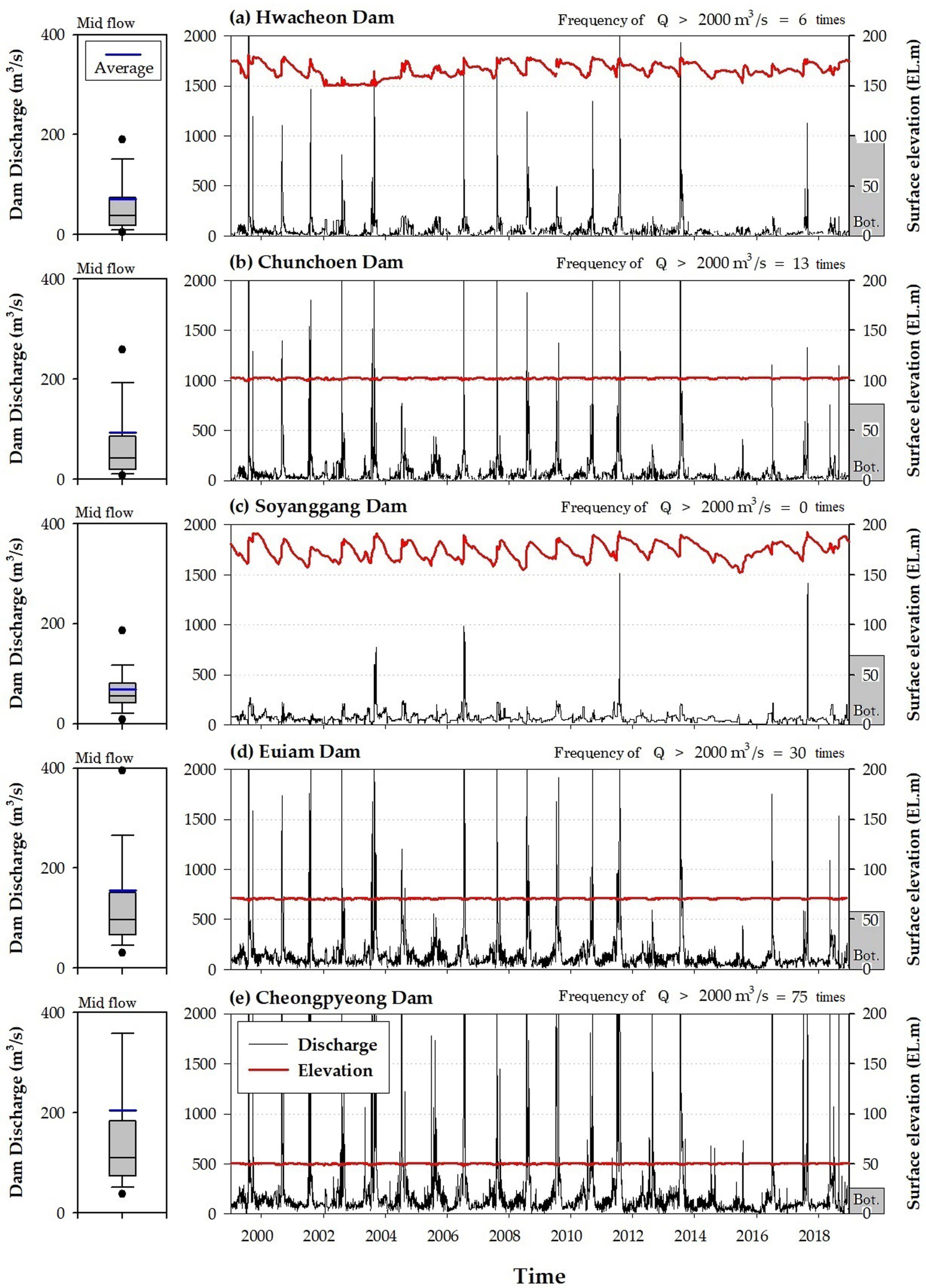 데이터를 사용하였다 (ME, 2019; MOLIT, 2019). 수질 자료는 매월 1회 또는 4회 를 주기로 조사되고 있으며, 2004년 이후부터는 댐 내부의 수층별 분석도 이뤄졌다. 댐방류량 자료는 일별
