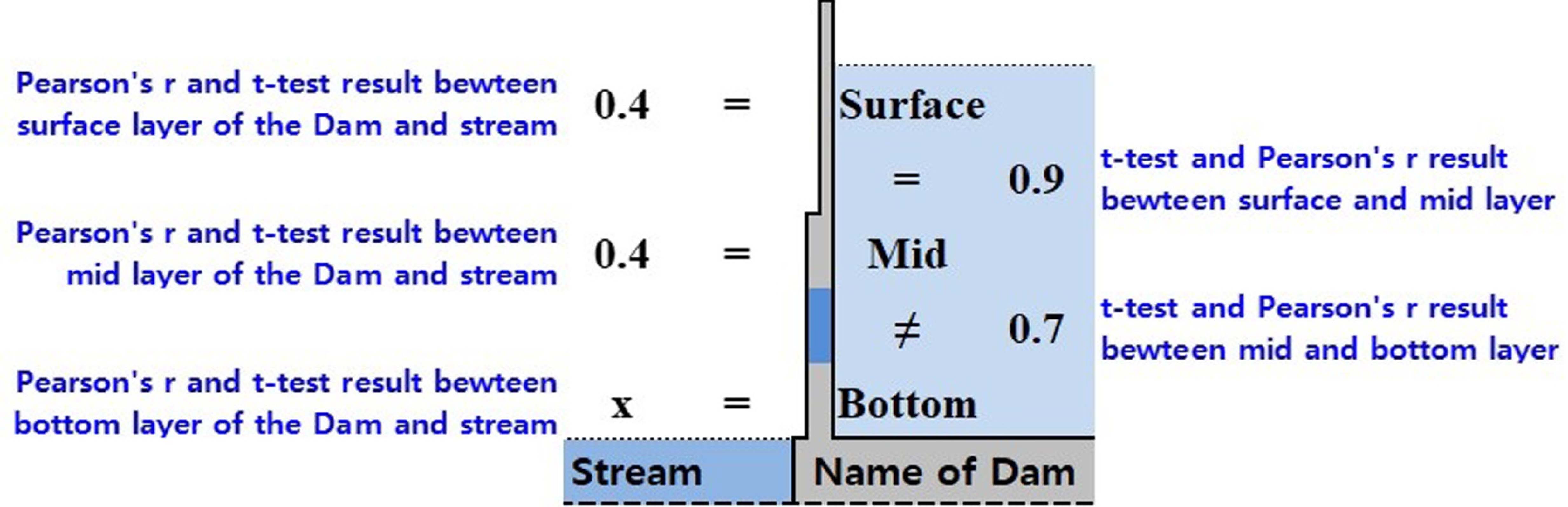 상관성과 유사성은 수질항목별로 통계기법을 적용하여 분석하고, 통계적 검정 결과에 기초하여 댐 내부 수층 간 그 리고 댐 내부와 하류 하천 간 수질항목별