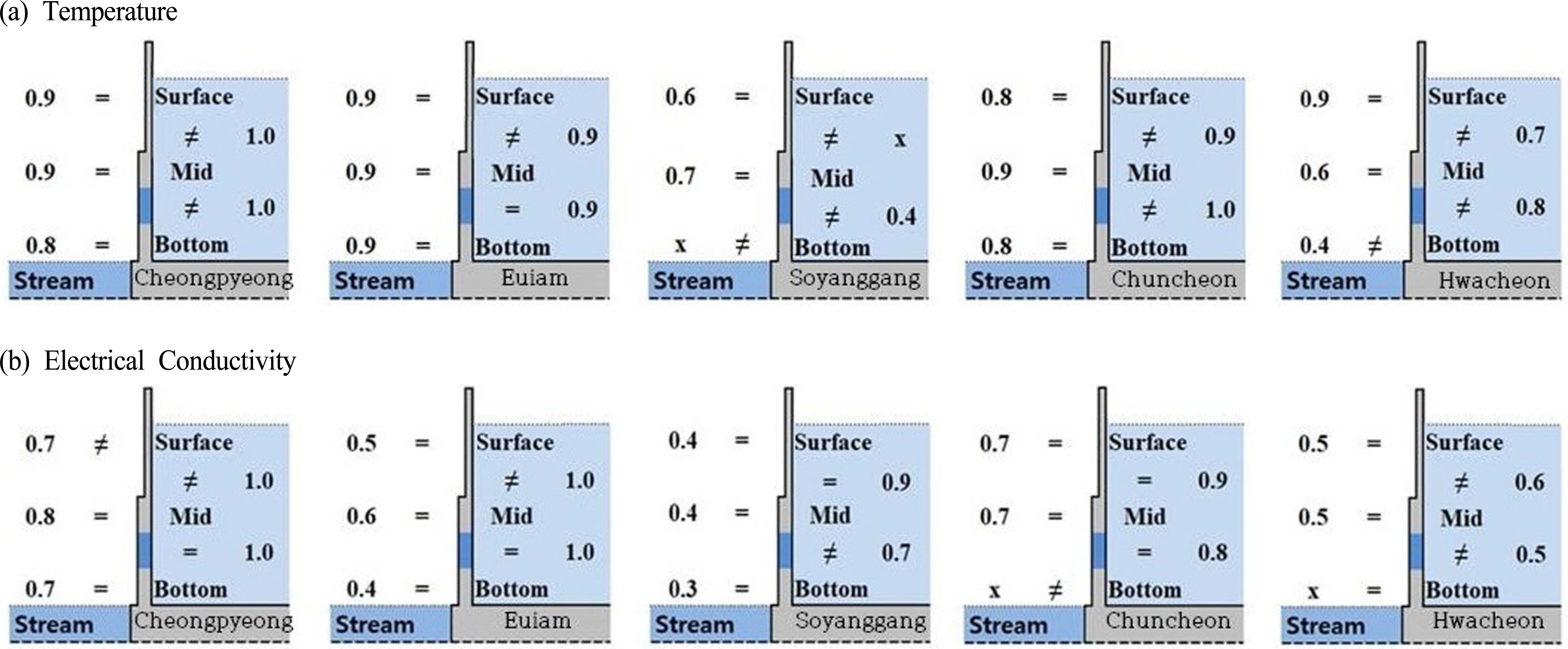 내부의 상층수와 하 부 수층 간 수온은 성층으로 인한 일반적인 현상으로 상이하 게 분포하며 수심이 깊은 화천댐과 소양강댐에서 뚜렷하였 다. 전기전도도의