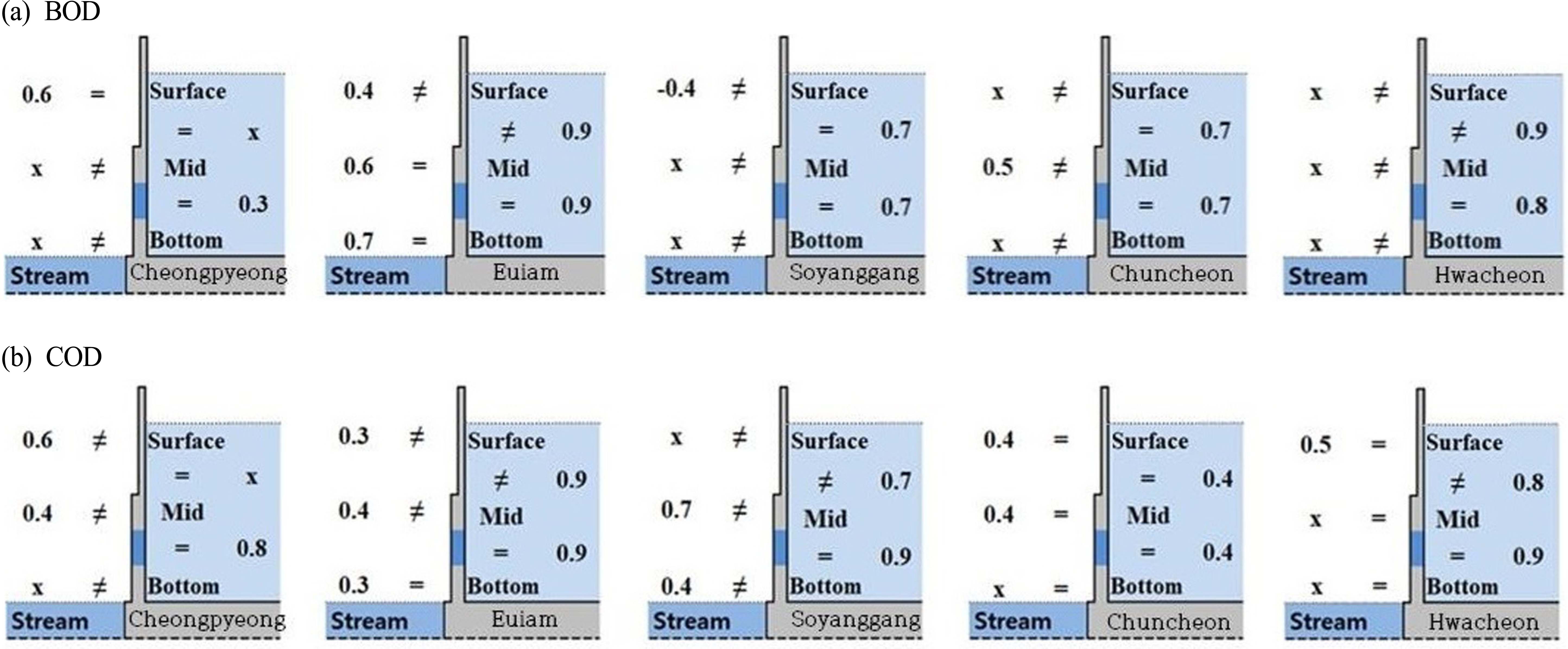 자연 하천에서 흐름에 따른 이화학적 경향은 외부 영향이 없을 경우 대부분 완만한 변화를 한다는 원리를 기초로, 북 한강 본류의 연속한 댐에 대해 취수구