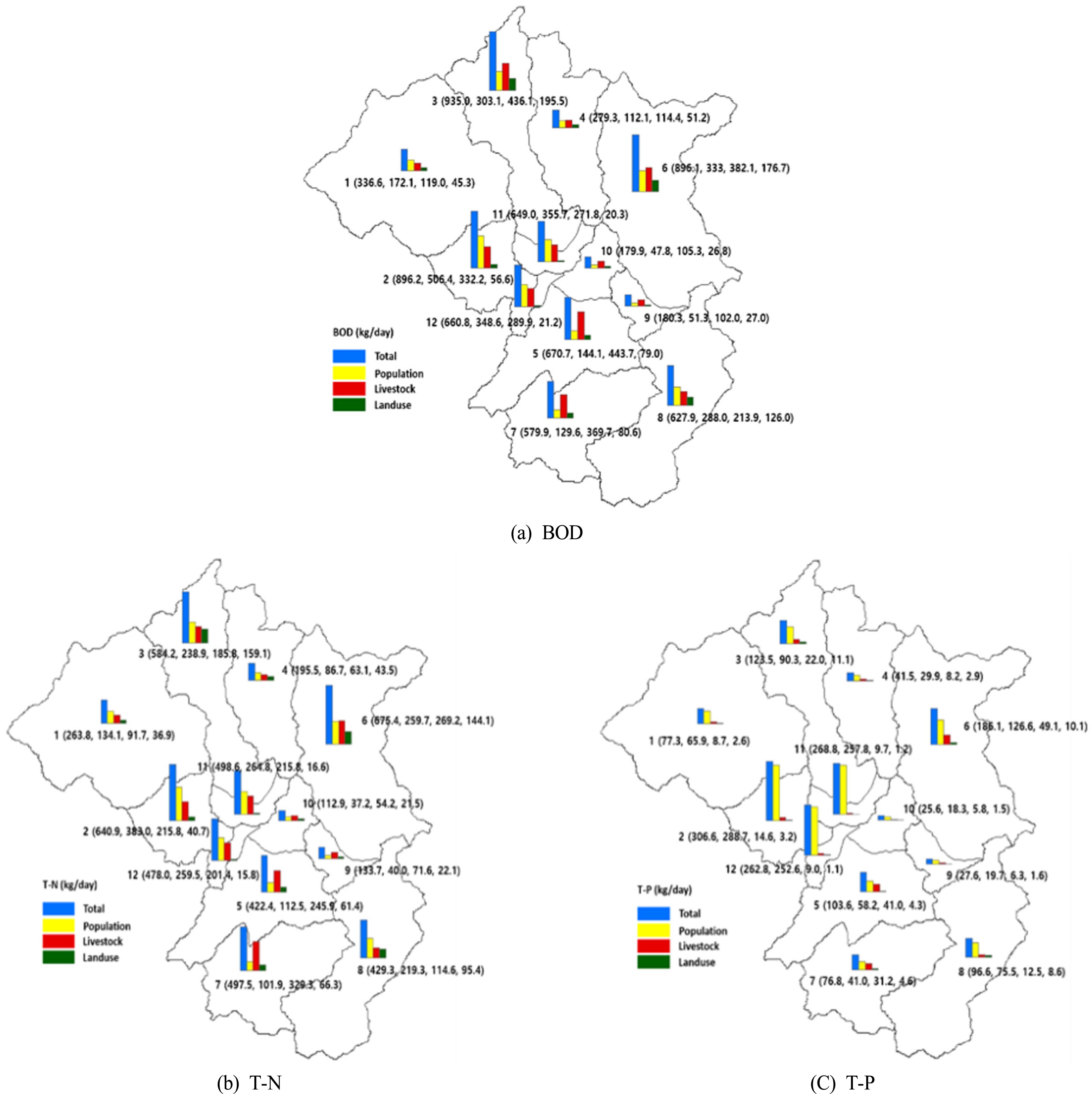 인구수, 사육두수 등을 이용하여 소유역별 배출량을 정량화하고 수질특성을 분석하기 위한 오염원별 수질오염 기여도를 분석하였다. 그 중 전체오염원 중
