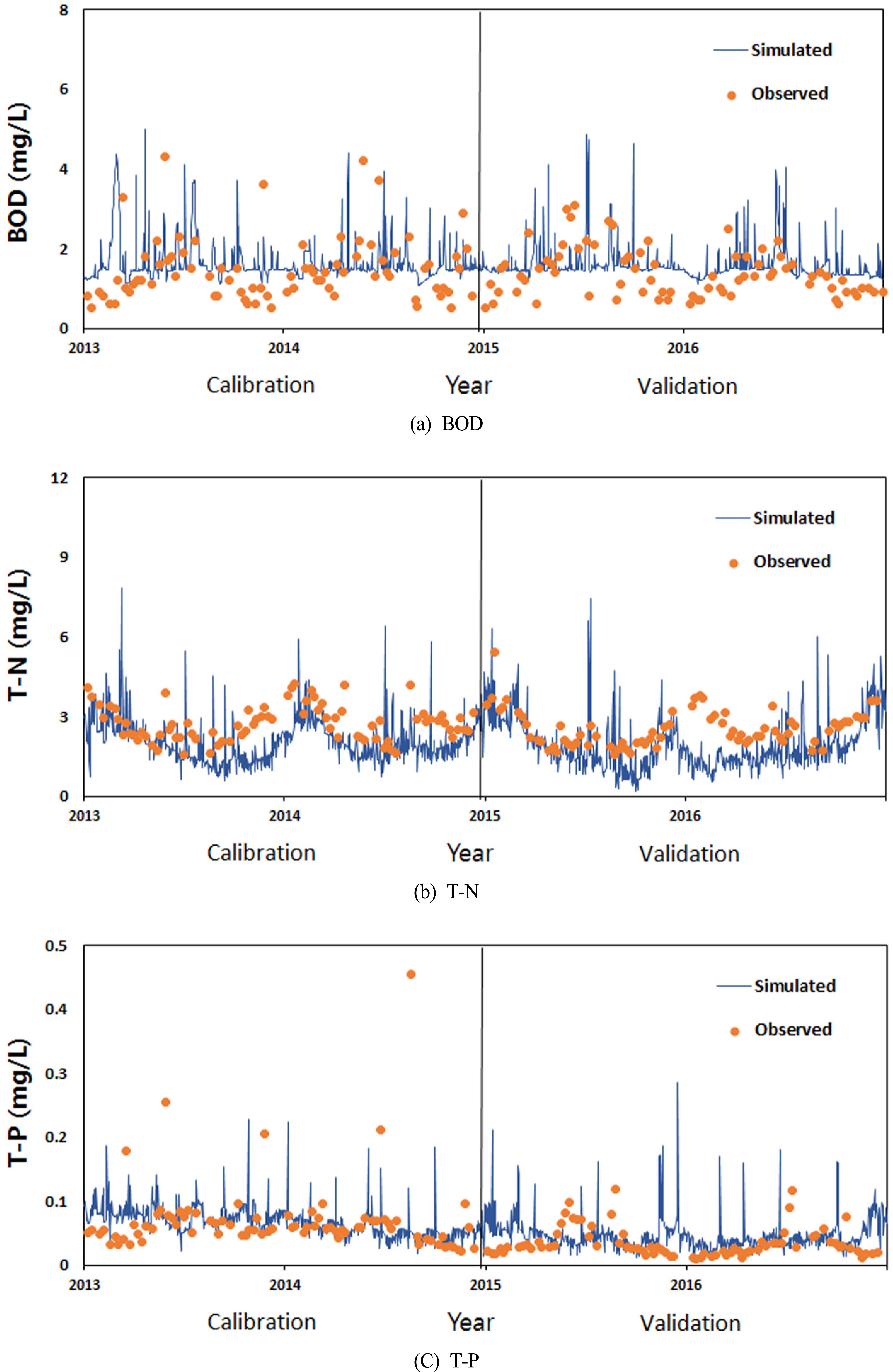 수질의 경우 2013년 ~ 2014년으로 이루어졌으 며 유출량, BOD, T-N, T-P 순으로 일별로 진행하였다. 검정 기간은 수문이 2004년