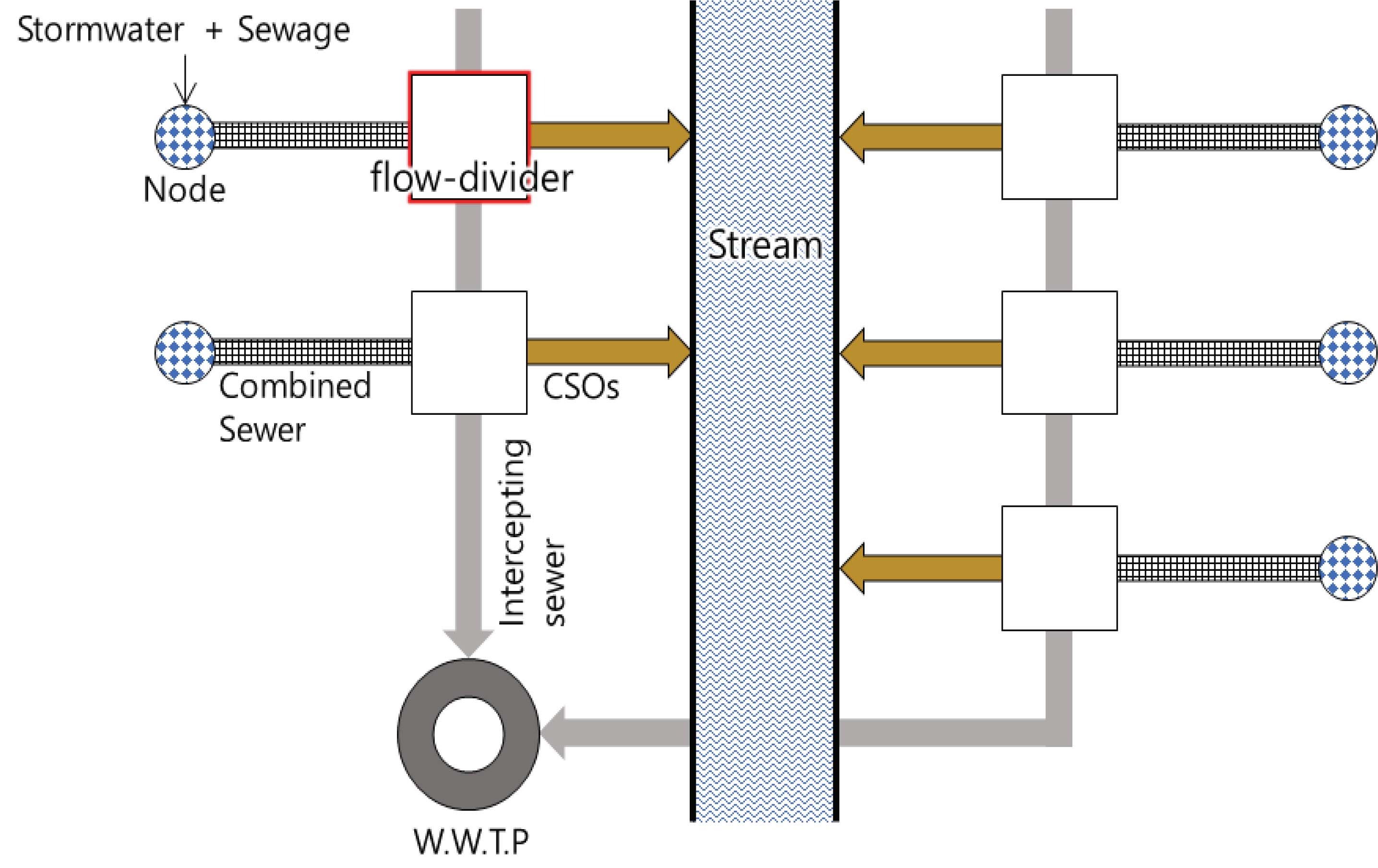 Fig. 2. Conceptualization of flow network for CSOs modeling in EPA-SWMM.