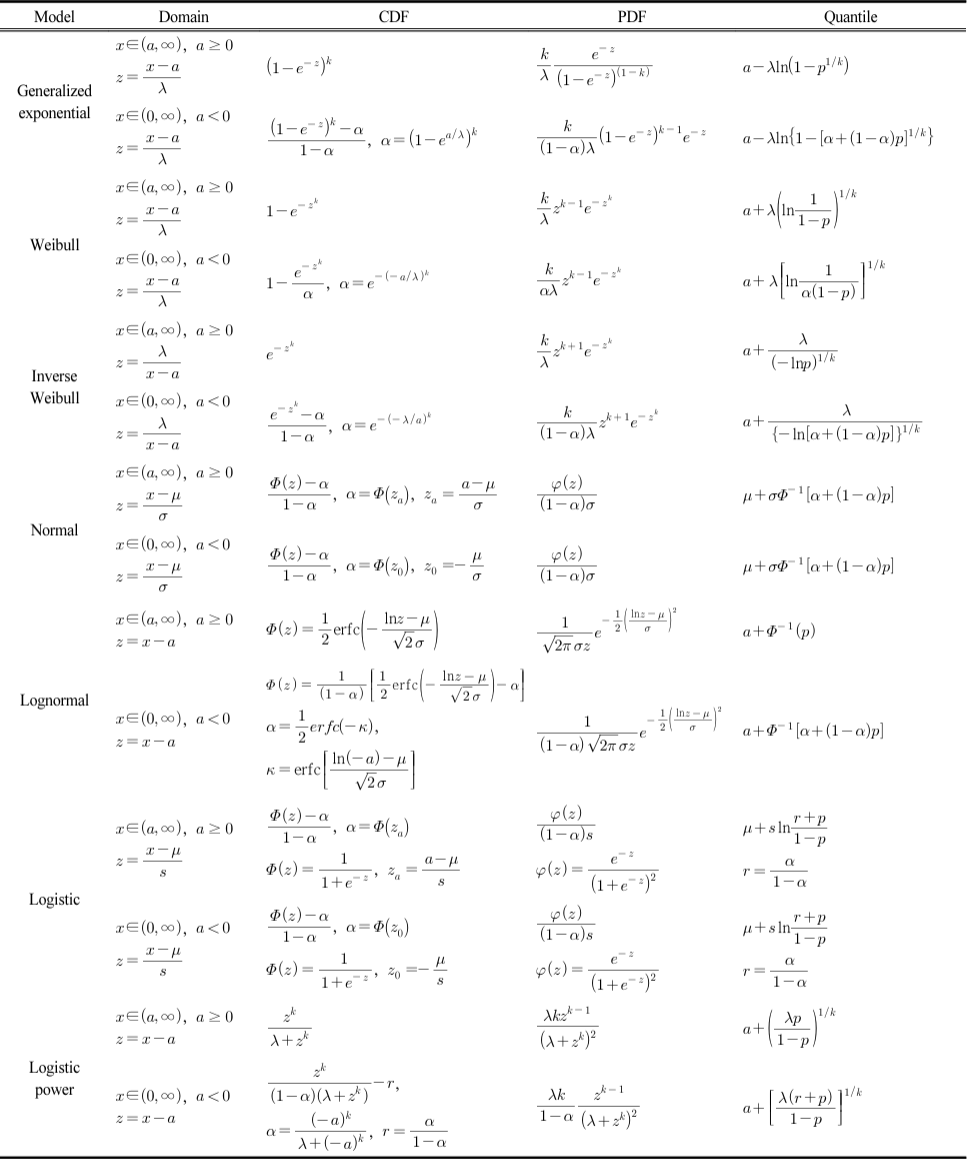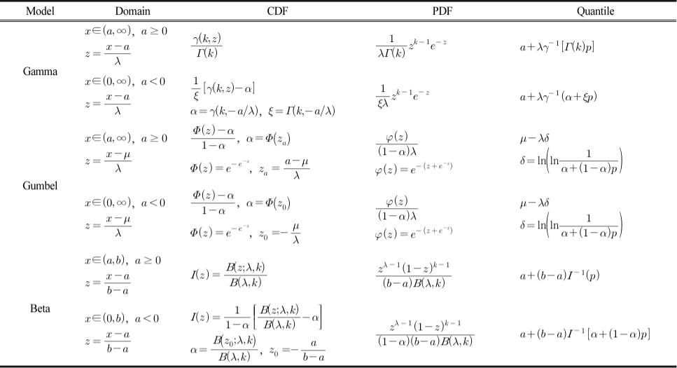 본 연구에 적용된 확률분포 모형은 9가지 3 인자(model parameter) 분포[일반지수(generalized exponential), 와이블(Weibull), 역와이블(inverse Weibull), 정규(normal), 대수정규(lognormal), 로지스틱(logistic), 로지스틱멱함수(logistic power), 감마(gamma), 굼벨(Gumbel)]와 역치값을 포함한 4 인자 분포[베타(beta)]였다. 각 모형은 이동형과 절단형으로 구분하였으므로 실질적인 모형의 수는 20가지가 된다. 일반적으로 모델인자가 많아지면 예측력은 높아지지만 모형인자 추정의 불확실성과 복잡성이 커지므로 효율성은 떨어진다. 따라서 모형 간의 적합성 및 효율성을 같은 기준으로 비교하기 위하여 베타분포 모형을 제외하곤 모형인자의 수를 동일하게 설정한 것이다.
