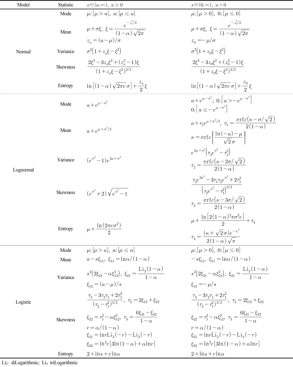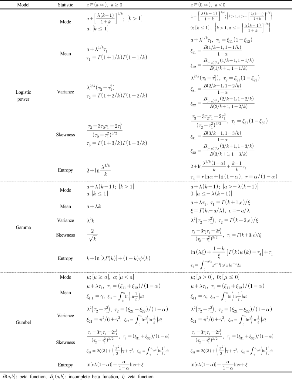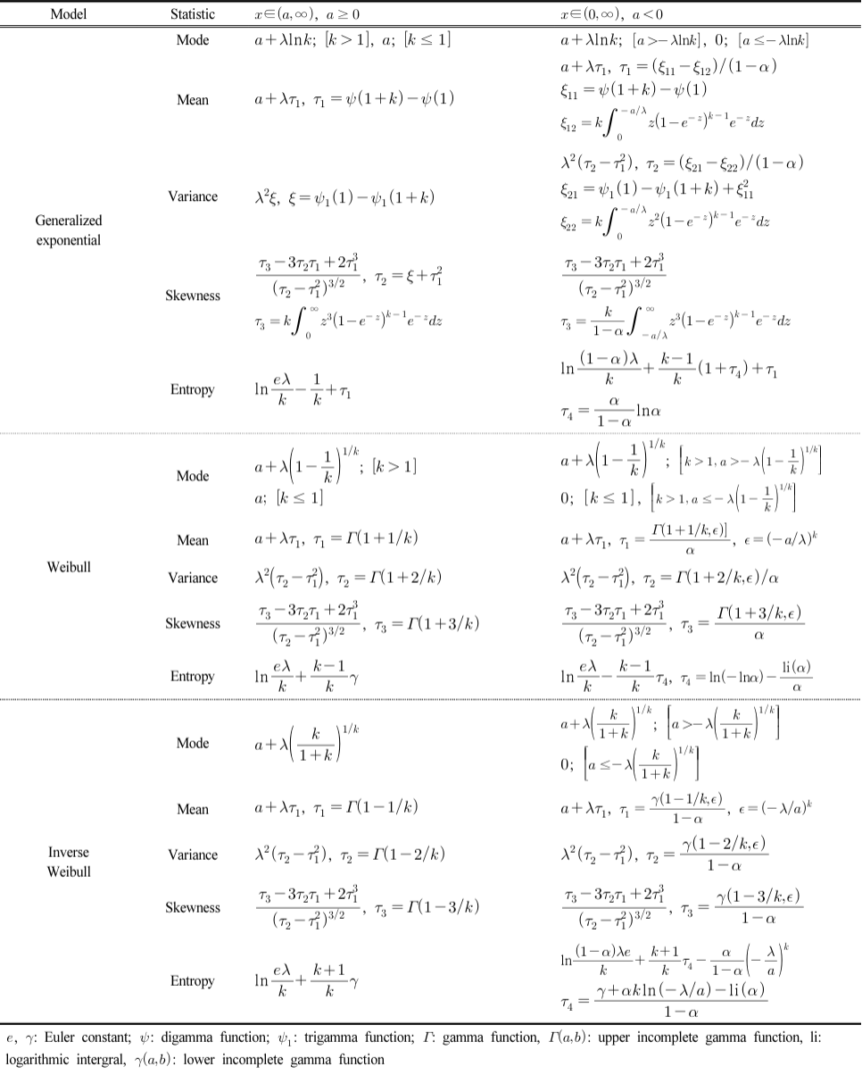 각 모형의 누적분포함수, 확률밀도함수, 백분위(quantile) 식은 Appendix 1과 같으며 각 모형에서 도출된 최빈값(mode), 중앙값(median), 평균(mean), 분산(variance), 왜도(skewness), 미분엔트로피(diffrential entropy) 식은 Appendix 2와 같다.