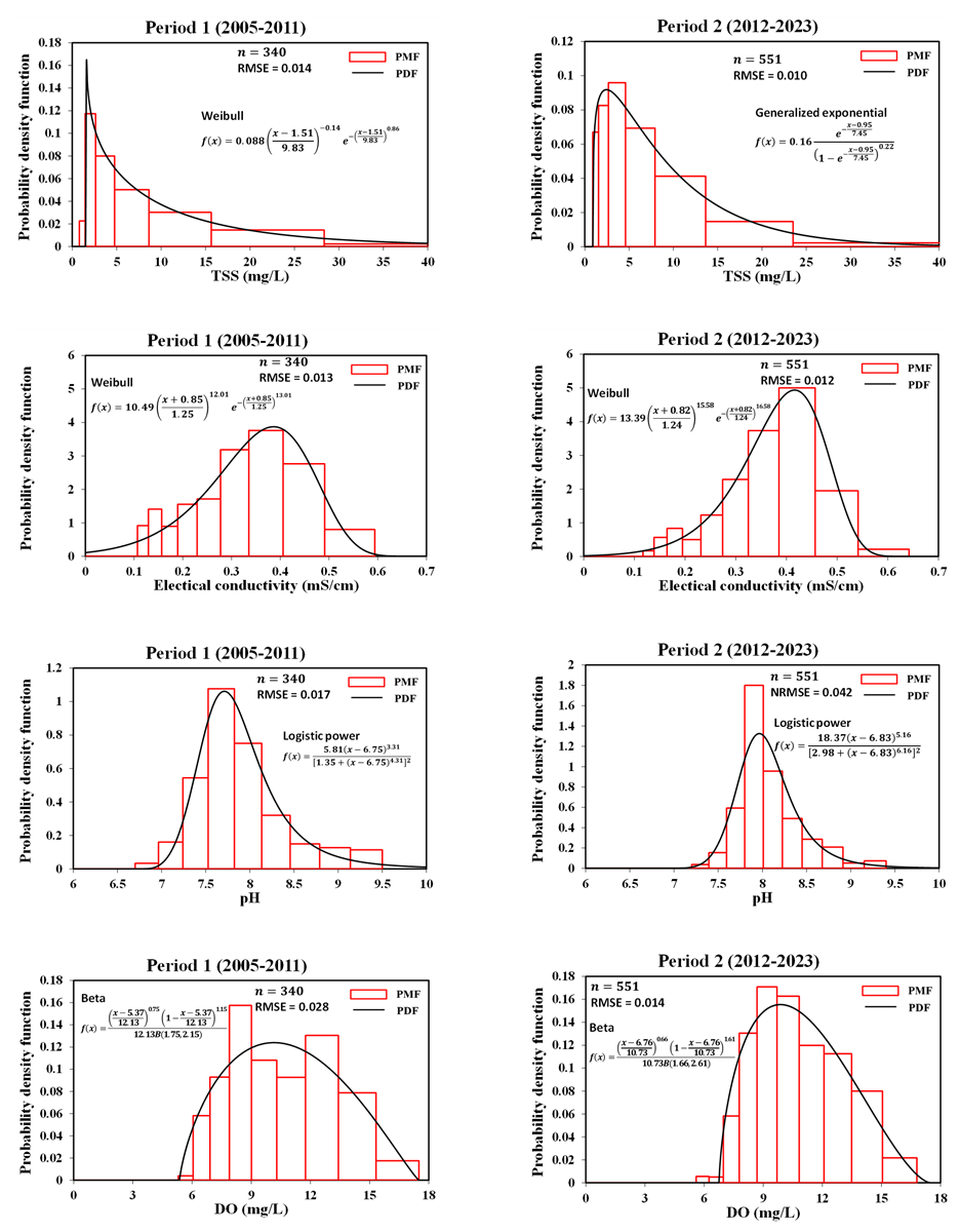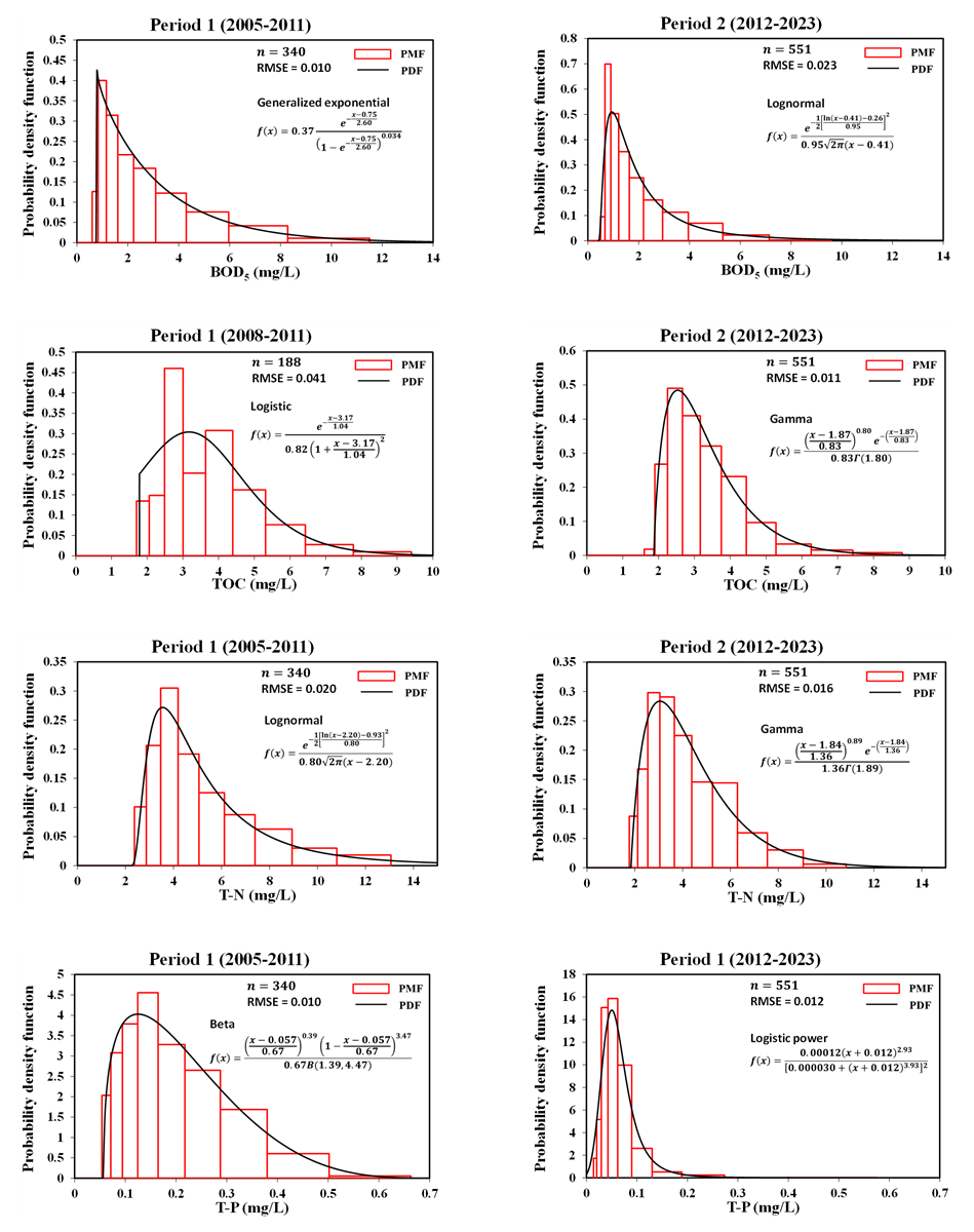 부적편포를 하는 전기전도도는 유연성이 큰 영절단와이블분포나 양측절단베타분포, 약한 정적편포를 보이는 용존산소는 양측절단베타분포, 약한 정적편포를 보이면서 최빈값의 첨두가 높은 pH는 이동로지스틱멱함수분포로 해석하는 것이 적합하였다. 그 외 뚜렷하게 정적편포하는 BOD5는 이동일반지수분포 또는 이동대수정규분포, TOC는 좌절단로지스틱분포나 이동감마분포, 총질소는 이동대수정규분포나 이동감마분포였다. 총인은 양측절단베타분포나 영절단로지스틱멱함수분포, TSS는 이동와이블분포나 이동로지스틱멱함수분포가 적합하였다.