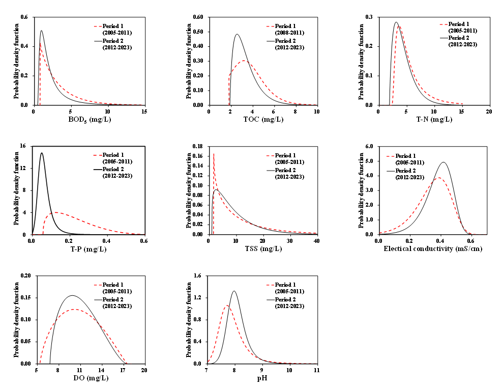 오염총량관리가 시작된 직후인 2005년부터 2011년까지를 1기, 수질개선이 안정적으로 이루어지고 하수처리장의 총인 방류수 수질기준이 강화된 2012년부터 2023년까지를 2기로 나누었을 때, 전기전도도와 pH 및 용존산소의 중앙값과 평균값 및 표준편차와 미분엔트로피는 시기 1보다 시기 2에서 증가하였고, 그 외 모든 항목은 시기 2에서 감소하였다.