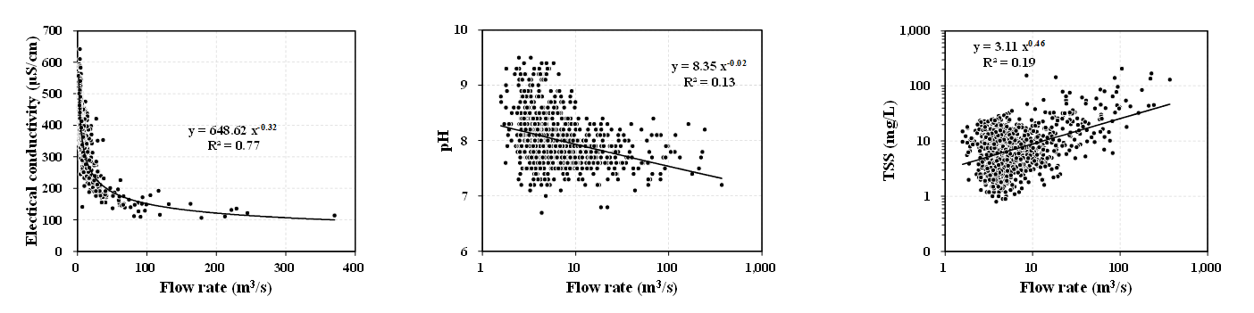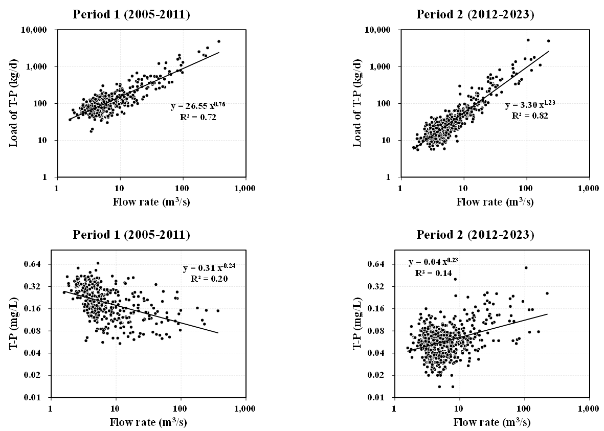 이러한 시기별 변화의 주요 요인은 pH, 전기전도도, TSS, 용존산소의 경우 시기별 강우의 차이에 따른 것이며 다른 수질항목은 수질개선대책의 효과에 수반된 것으로 판단된다. 특히 2012년 하수처리시설의 방류수 수질기준이 강화된 이후 총인 농도가 뚜렷하게 감소하였으며 그 결과 총인농도의 유량의존성이 크게 변화된 것을 확인할 수 있었다.