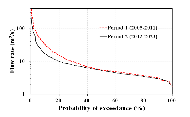 분석에 사용된 자료는 경안B 오염총량관리 단위유역 말단지점에서 2005년부터 2023년까지 측정된 유량과 수질로 환경부 물환경정보시스템(http://water.nier.go.kr)에서 추출하였다. 해당 유역에서 총량관리를 통하여 수질개선 대책이 시작된 직후 년도인 2005년부터 2011년까지를 1기(period 1), 수질개선이 안정적으로 이루어지고 하수처리장의 총인 방류수 수질기준이 강화된 2012년부터 2023년까지를 2기(period 2)로 구분하여 자료를 분석하였다. 수질항목 중 총유기탄소는 2008년부터 모니터링되었으므로 해당 항목에 한하여 1기 기간은 2008년부터 2011년이었다.