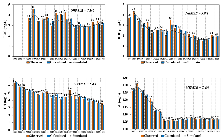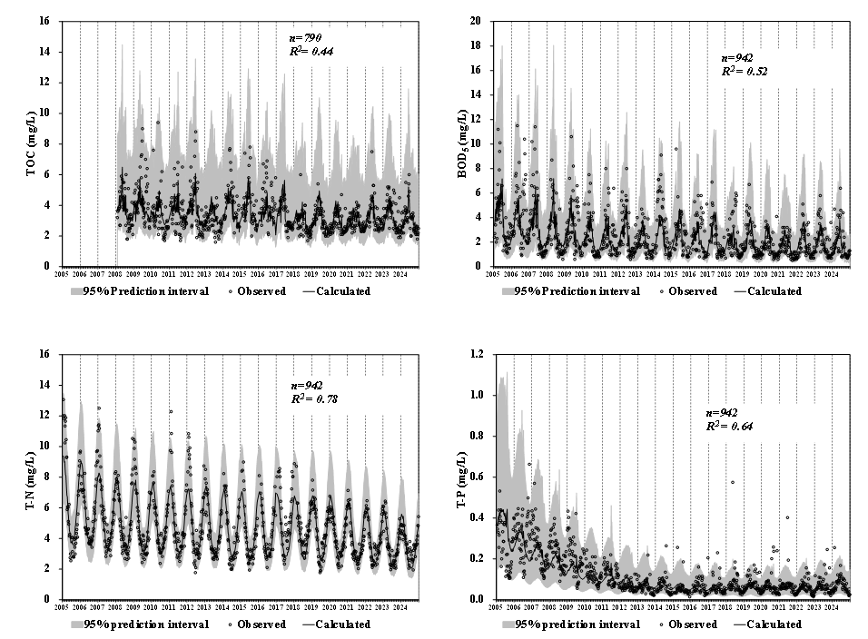 값과 최근 2022∼2024년의 모형 평균값을 비교한 결과는 Table 3과 같다. 유량효과를 배제하고 시계열적으로 비교하였을 때, 최근에 총인은 74%, BOD5는 52%, 총질소는 38%, TOC는 17%가 감소한 것으로 분석되었다. 유역 내 오염원의 증가에도 불구하고, 수질오염총량관리를 비롯한 여러 수질개선대책의