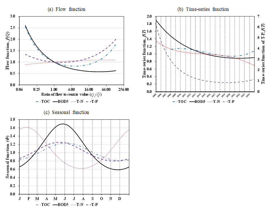 식 6을 식 7의 유량함수, 식 8의 시계열 함수, 식 9의 계절함수로 분리하여 도시한 결과는 Fig. 3과 같다. 유량함수로 볼 때 유량이 증가하면 BOD5 농도는 감소하고, T-N 농도는 큰 변화가 없으며, TOC와 T-P 농도는 감소 후 증가하는 것으로 분석되었다.