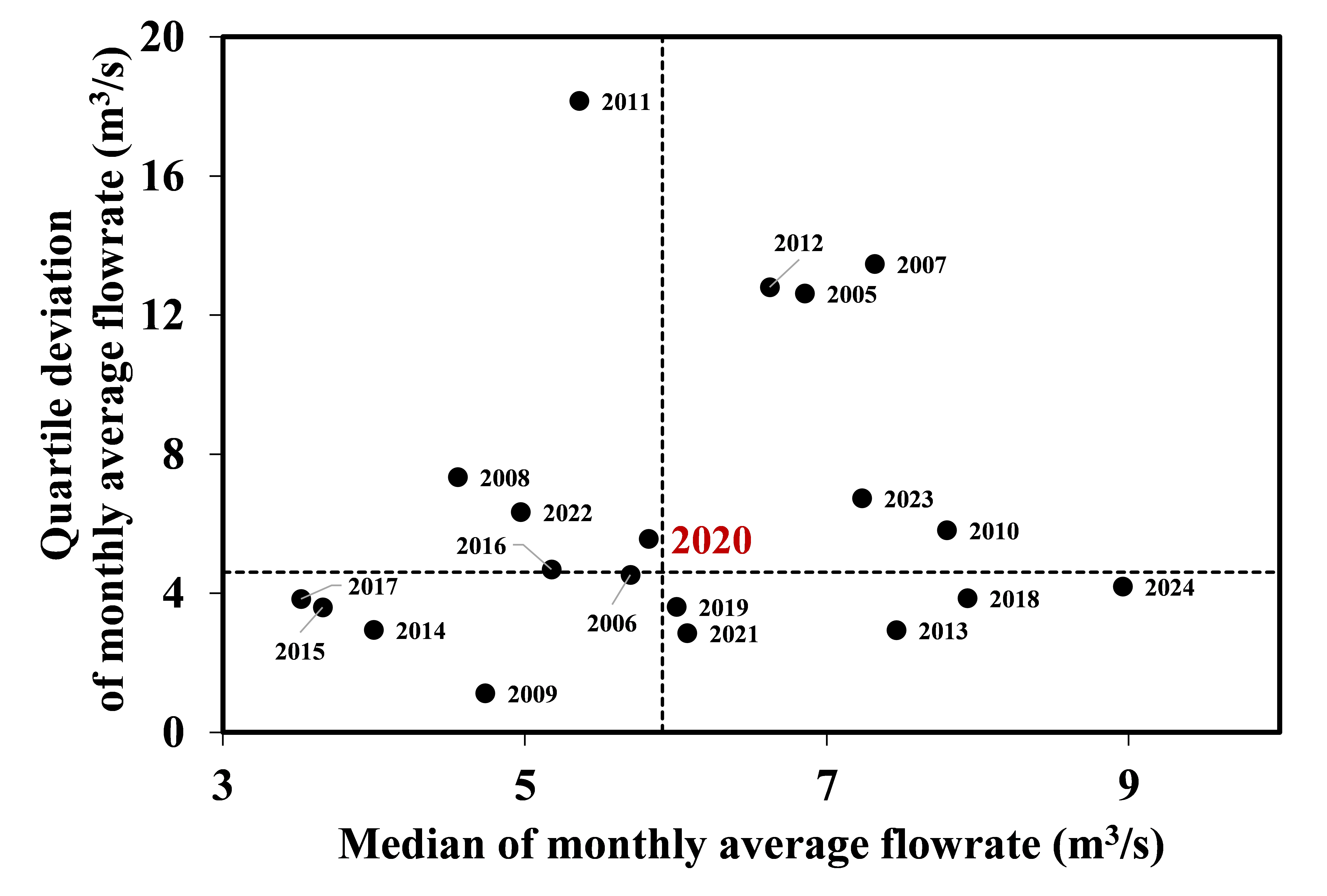 각 연도의 월평균유량의 중앙값과 월평균 유량의 4분편차를 계산한 후, 연간 값들의 중앙값에 가장 가까운 연도의 유황으로 설정하였다. 이러한 분석을