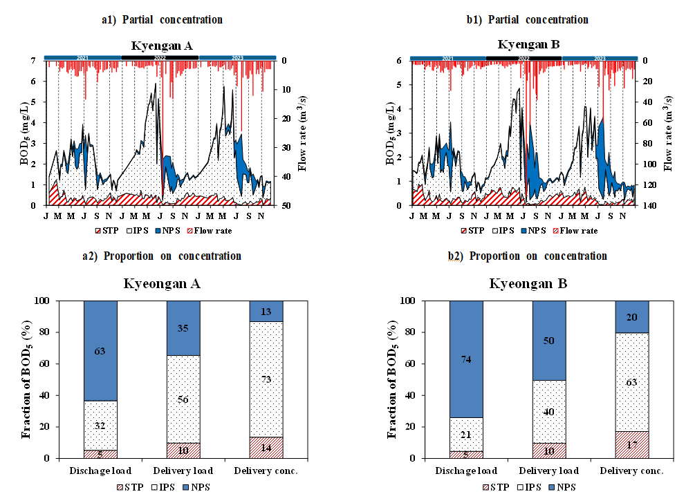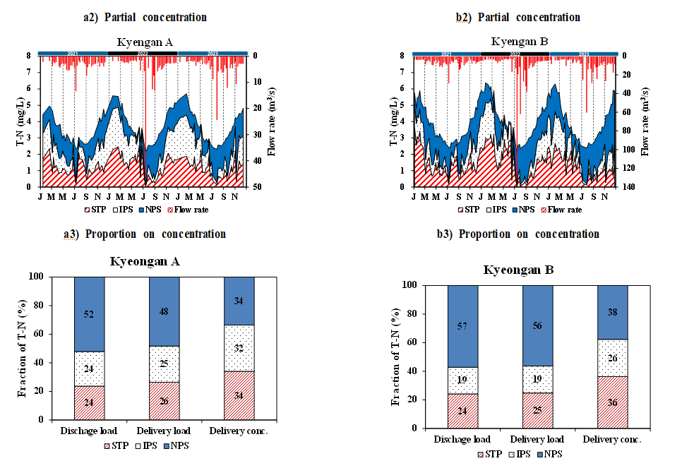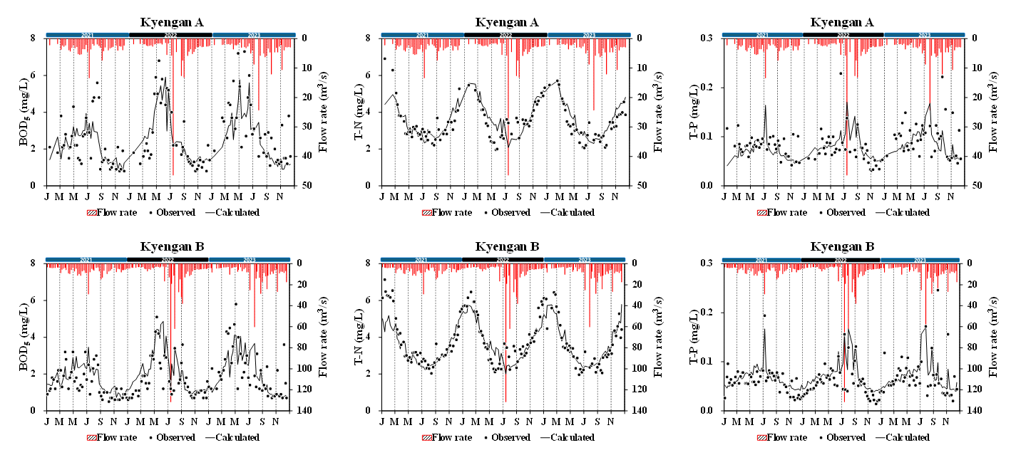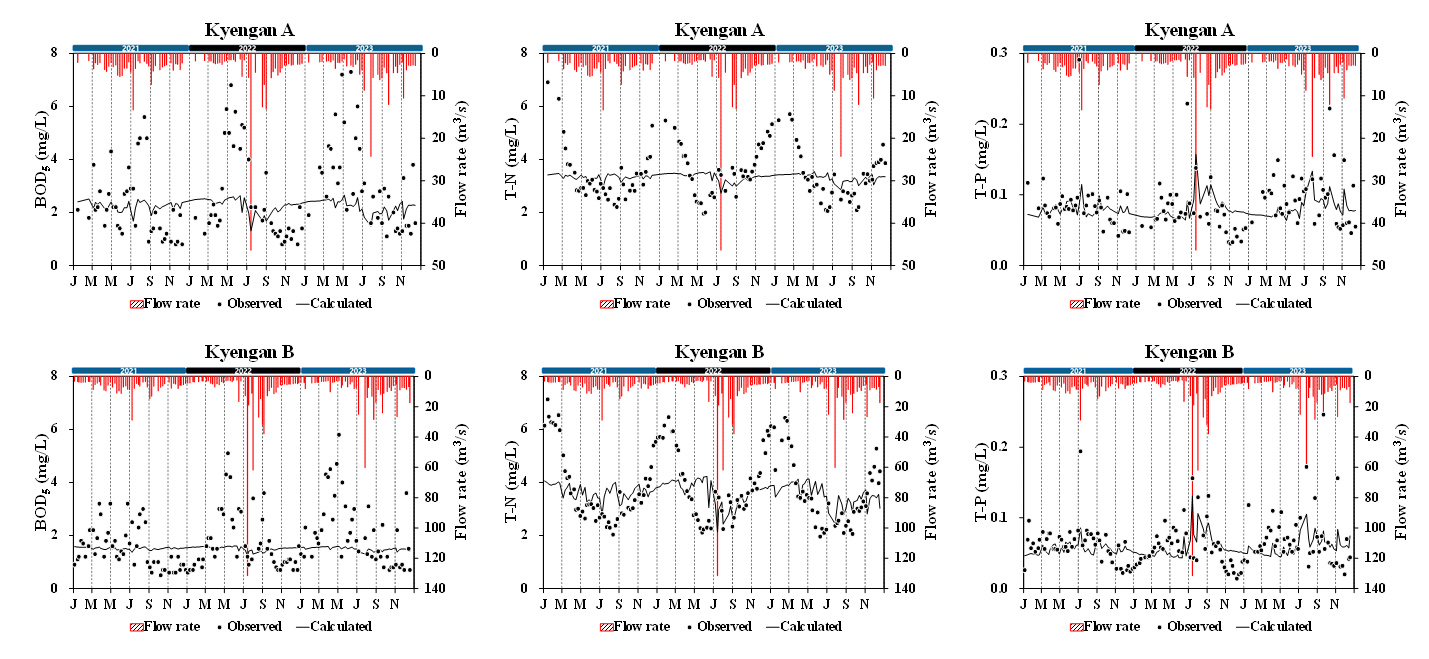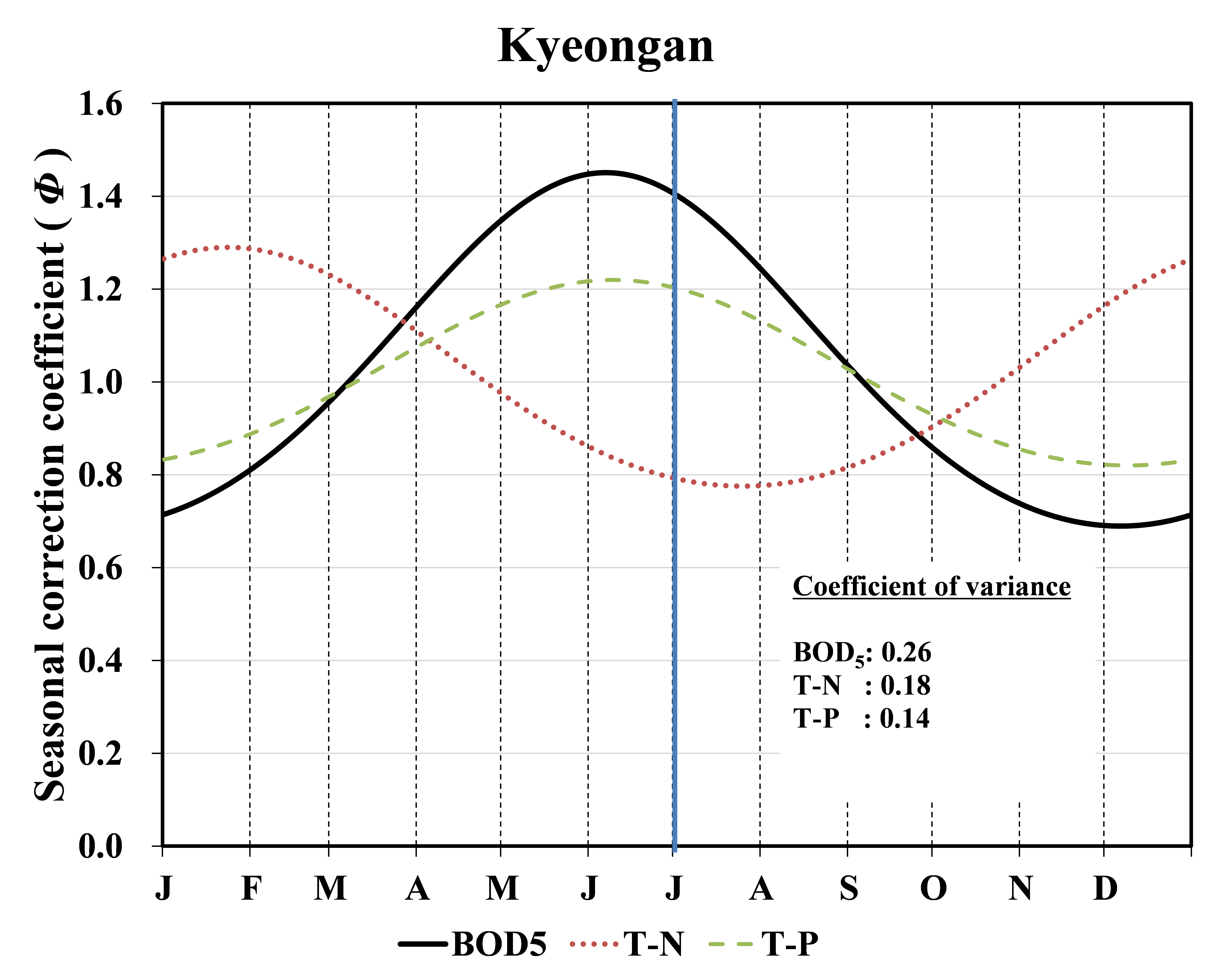 ๋ณธ ์ฐ๊ตฌ์์ ์๋ก์ด ์ ์๋๋ ๋ชจํ์ Cohn et al. (1992)์ ๋ก๊ทธ-์ ํ ๋ชจํ์ ์์ฑ๋ณ๋ก ์ธ๋ถํ์ฌ Kong et al. (2015)์ ์์ ์กฐํฉํ ๊ฒ์ผ๋ก(Table 2), ์ ๋ฌ๋ถํ(L, delivery load)-์ ๋(Q, flowrate)-๋ฐฐ์ถ๋ถํ(L, discharge load)-๊ณ์ ์ฑ(S, seasonality)์