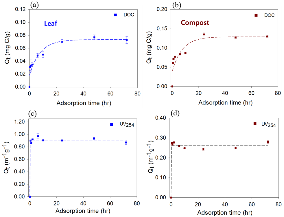 기저유출 과정 중 토양 흡착에 대한 영향을 평가하고자 흡착 실험을 수행하였다. 흡착 동역학 실험의 경우 배치(batch) 방식으로 수행되었으며, DOM