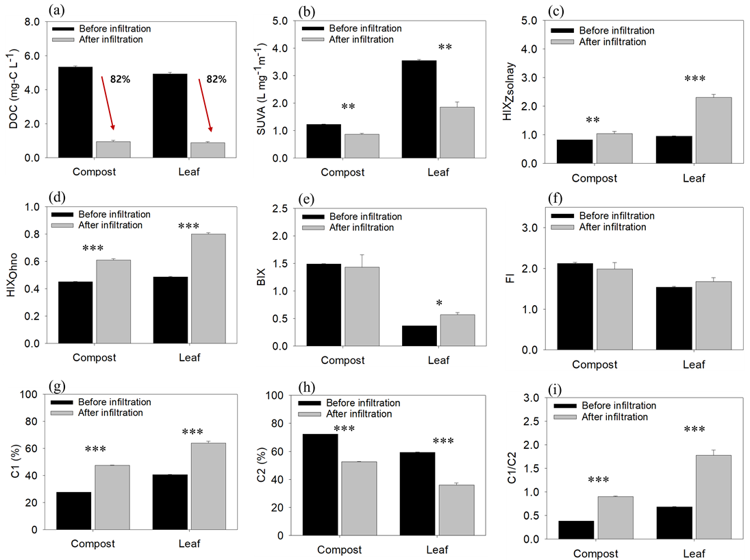 기원인 낙엽과 인위적 기원인 퇴비를 대조적 끝성분으로 설정하고, 다양한 혼합비 조건에서 토양 흡착 전후 DOM의 분광 지표 특성 변화를 비교한다.