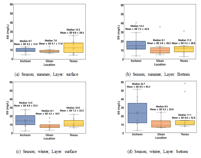 단위로 측정되었고, 매년 2월(겨울)과 8월(여름) 연 2회 채취되었다. 부유물질(SS) 농도는 동일 기간 각 해역의 계절(겨울⋅여름)및 수심(표층⋅저층)자료를