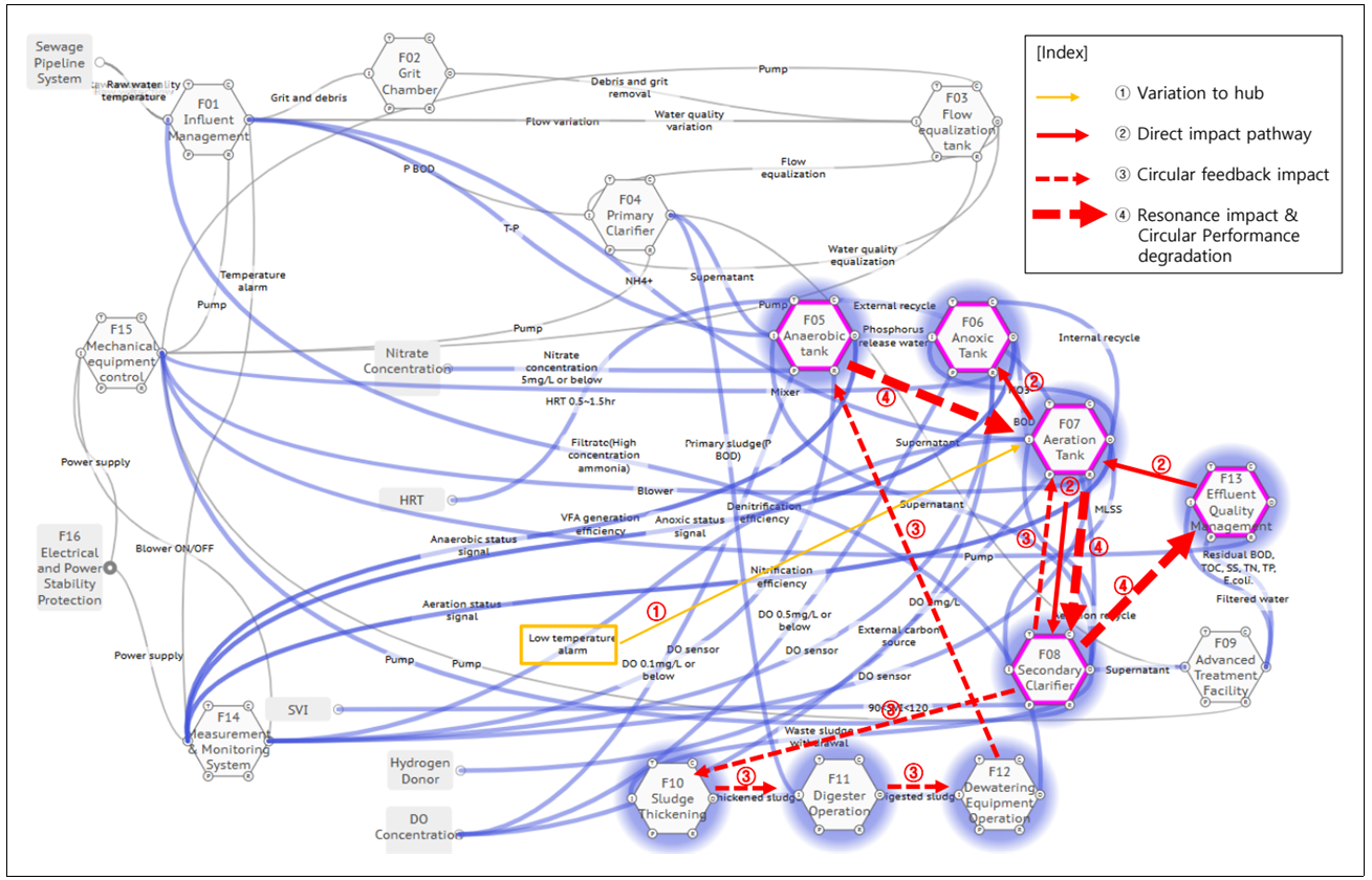 특히 동절기 유입하수의 저수온으로 인한 질소 제거 효율 저하 사례 분석 22건을 통해 F07(폭기조) 중심의 허브-스포크 구조와 순환 피드백 메커니즘을