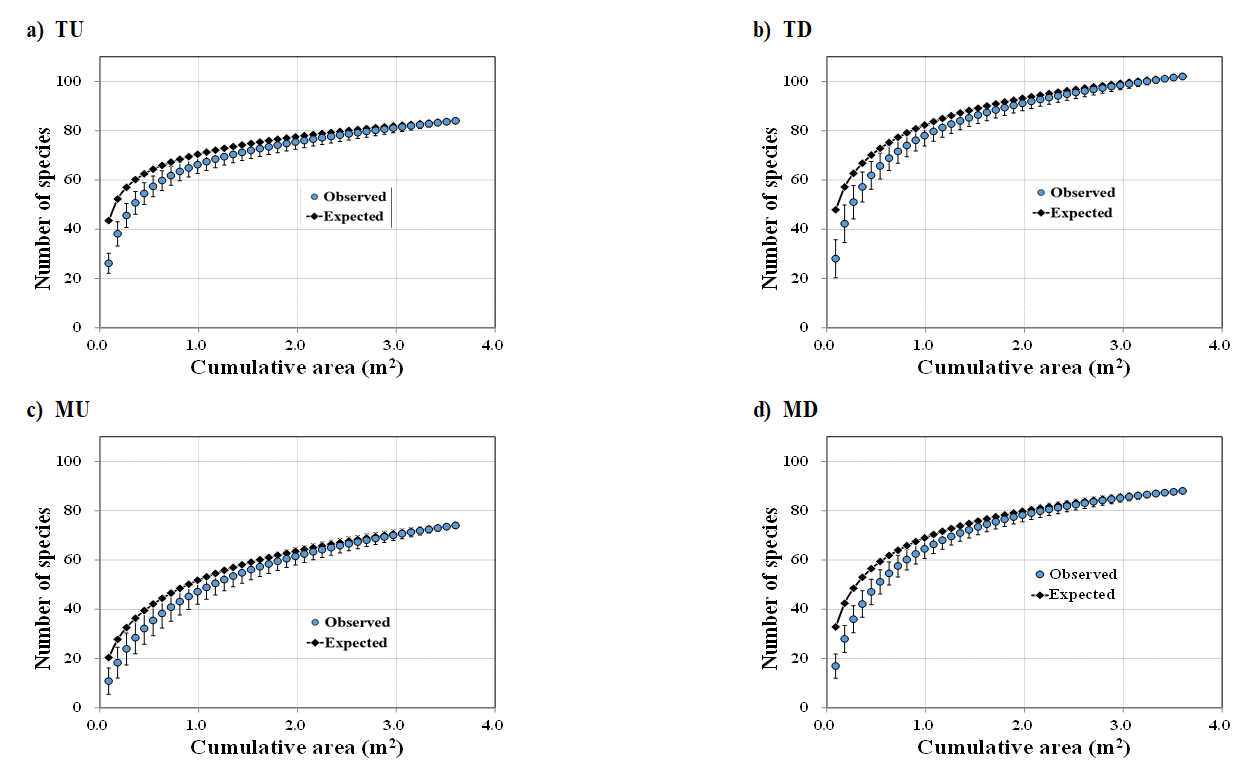 최적의 적합도를 보이는 모형을 적용하여 식 5로부터 도출된 $R_{1}$의 최대값에 해당하는 조사면적은 MU (65 m2), TD (17 m2), TU (13 m2), MD (7 m2)의 순으로 컸다(Fig. 8). $R_{1}$은 0.09∼0.27 m2의 작은 조사면적에서는 TD>TU>MD>MU의 순으로 컸지만 외삽 구간에서는 MU>TD>MD>TU의 순이었다. $R_{2}$의 최대값은 조사면적이