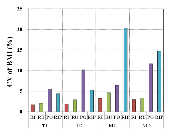 다른 지수와 달리 지점별 BMI 값의 순위는 모든 조사면적 구간에서 유지되었으며 최대 BMI는 MU(91.9)>TU(87.3)> TD(85.9)>>MD(79.9)의