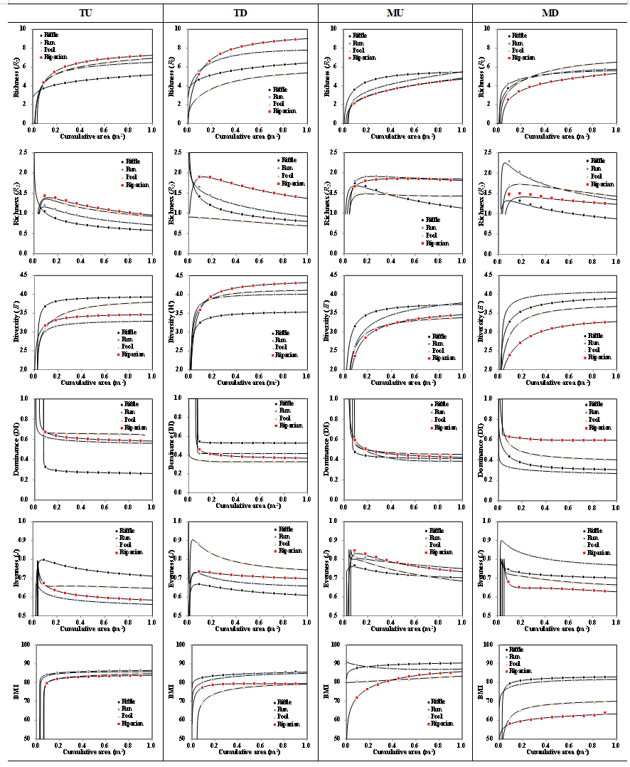 MD > MU > TD > TU 순이었다. 이는 하천 규모가 클수록 종다양성에 대한 수용력이 높다는 것을 시사한다.