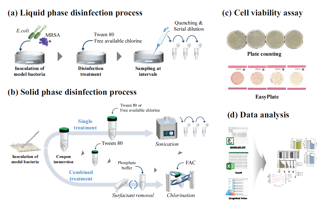 본 연구의 궁극적 목적은 소수성 표면에서 병원성 미생물 불활성화 효율을 제한하는 기존 염소 소독 공정의 구조적⋅화학적 한계를 규명하고, 이를 극복하기