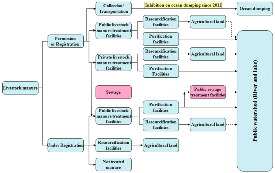 중 오수, 분뇨에 관하여는 ‘하수도법’에 통합하여 규정하고, 가축분뇨에 관하여는 ‘가축분뇨 관리 및 이용에 관한 법률’을 2006년 제정하였다(NIER, 2013). 이를 통해 가축분뇨는 축산농가에서부터 허가 및 신고를 거쳐 정화·자원화 등으로 처리한 후 농경지에 투입되거나 공공수역으로 배출하도록 규제하고
