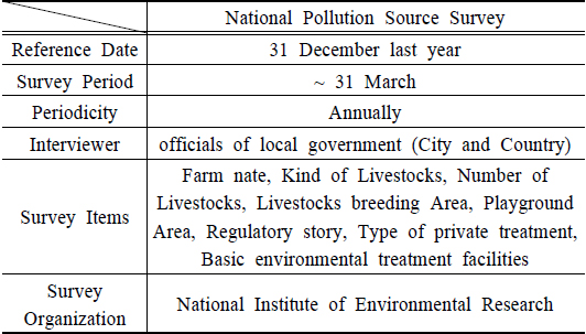 사육두수에 대한 조사는 전국오염원조사, 가축동향조사, 가축통계조사 등으로 크게 구분될 수 있다. 전국오염원조사는 2000년도부터 수질오염총량관리 및