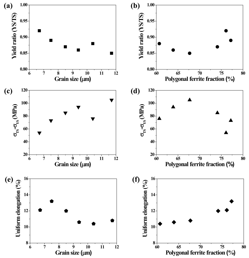 Effect of the (a, c, e) grain size, and the (b, d, f) polygonal ferrite fraction on