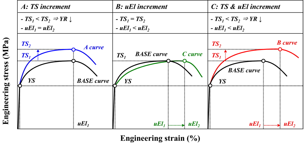 with different tensile strength (TS) and uniform elongation at the same yield strength