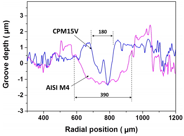Comparison of wear scar profiles after ball-on-disc wear test.