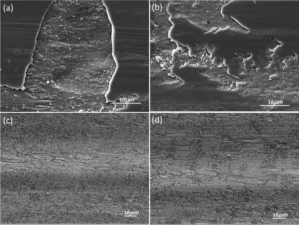 Micro-images showing morphology of the wear scars: M4 (a), (b) and CPM15V (c), (d).