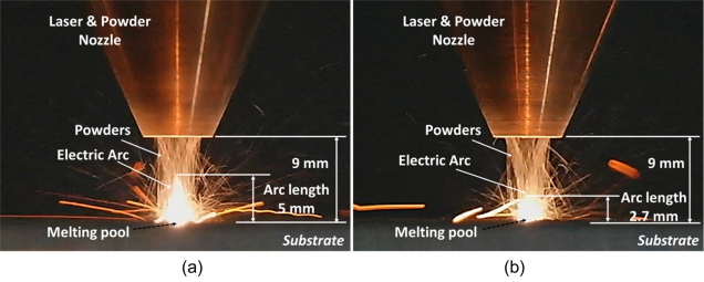 Arc plasmas during deposition of (a) M4 and (b) CPM15V powders.