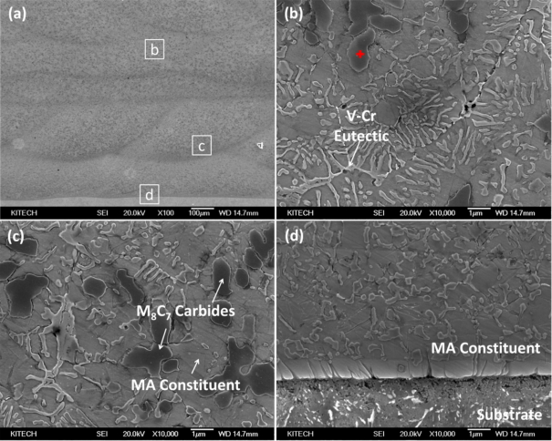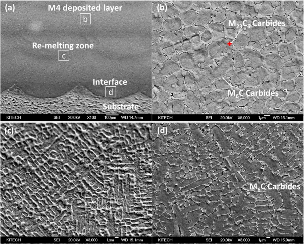 SEM images of (a) as-deposited M4, (b) deposited region, (c) re-melting zone and (d)