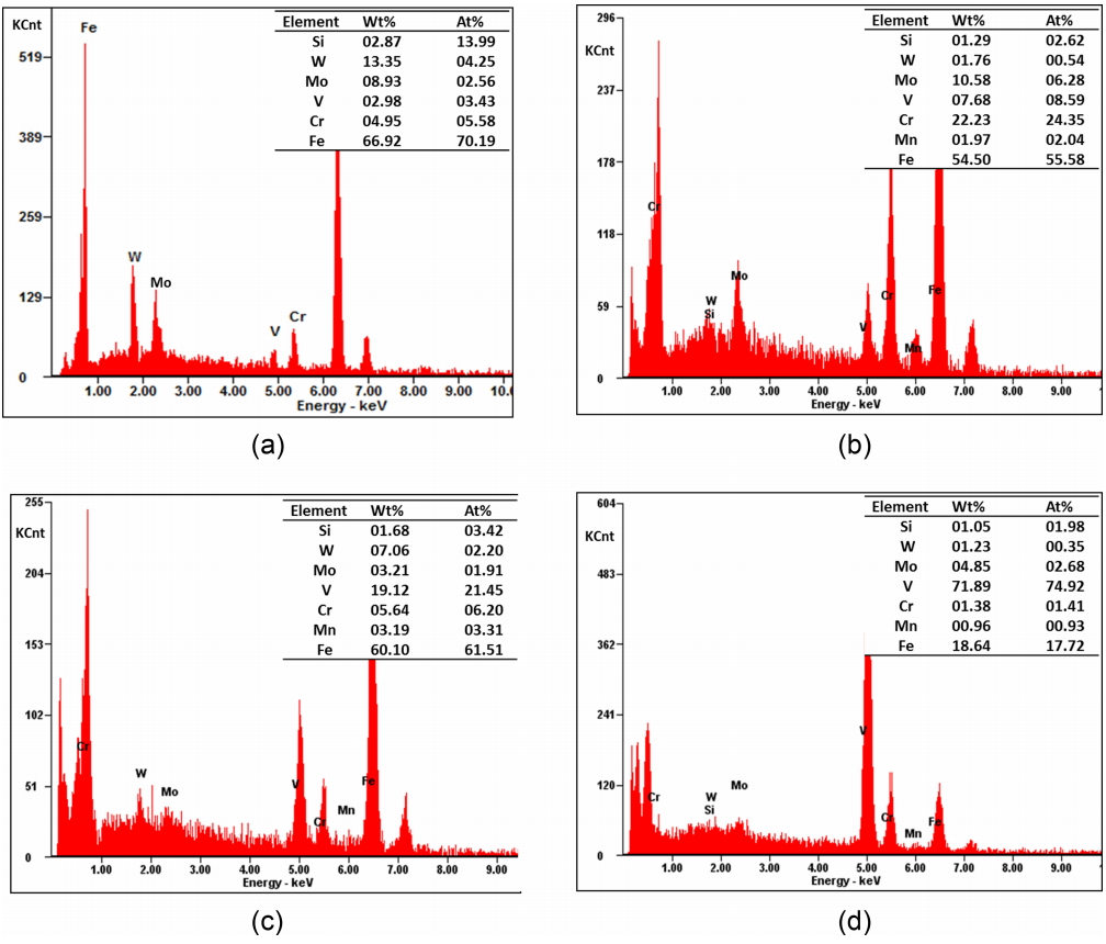EDS spectra of (a) deposited M4 region, (b) dendrite carbide in Fig.6(b), (c) deposited CPM15V region, and (d) V-Cr carbide in Fig. 7(b)