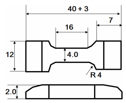 가지고 있기 때문에 인장 시편의 gage length에는 한계가 있다. 따라서 가공 가능한 횡 방향 인장 시편은 그림 1에 보인 바와 같이 gage length가 16 mm, 시편의 폭은 4 mm, 두께는 2 mm의 판상 시편이다. 그림의 인장 시편 어깨를 걸어 인장