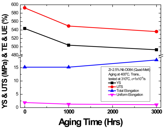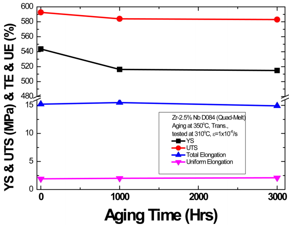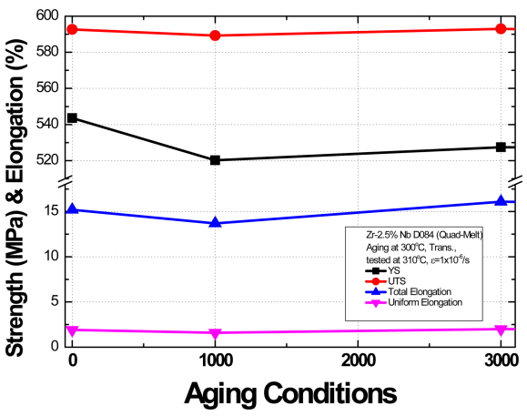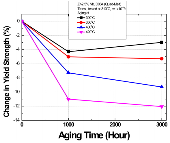 재료를 열적으로 시효 처리하여 outlet 온도인 310 ºC에서 압력관재료의 기계적 성질에 미치는 효과를 분석하였다. 아울러 변형 속도의 효과 및