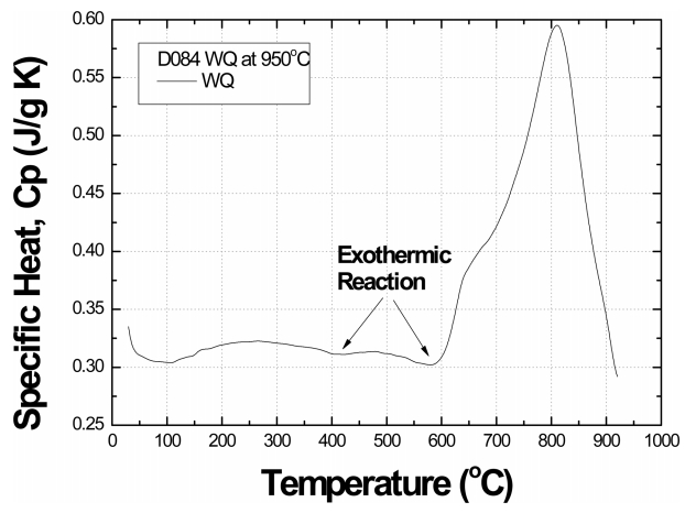 상변태를 수반하지 않는다면 비열은 온도의 증가에 따라 증가한다. 그러나 Zr-2.5%Nb 합금은 그림 2에 보인 바와 같이 410 ºC 및 590 ºC에서 비열의 감소가 나타나고, 이것은 이 온도에서 발열 반응이 일어난다는 의미이다. 이와 같이 DSC