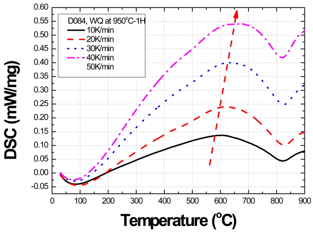 그림 3은 WQ 압력관 시편에 대하여 가열 속도를 변화시키며 DSC 분석 결과를 함께 나타낸 것이다. 즉, 가열 속도의 증가에 따른 발열 반응의 온도 변화를