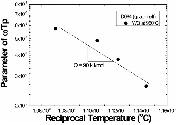 그림 4는 압력관 재료에서 발열 반응에 대한 활성화 에너지를 도시한 것이다. 950 ºC-1 H 후 수냉 (WQ) 처리한 4회 용해 Zr-2.5%Nb 합금에서