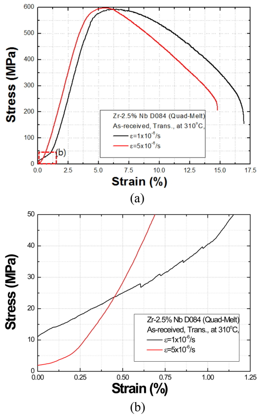 파단된 사례가 있다 [2]. 이에 반해 Zr-2.5%Nb 합금은 상대적으로 높은 항복 강도를 가지고 수소 흡수율도 낮아 압력관 재료로 대체 사용되었다.