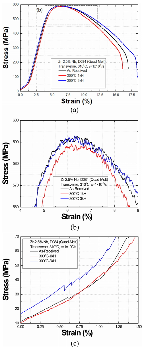 시험 온도는 압력관의 outlet 온도인 310 ± 2 ºC에서 실시하였다. 인장 시험편의 수는 as-received 시편은 3개를 시험하여 평균값과