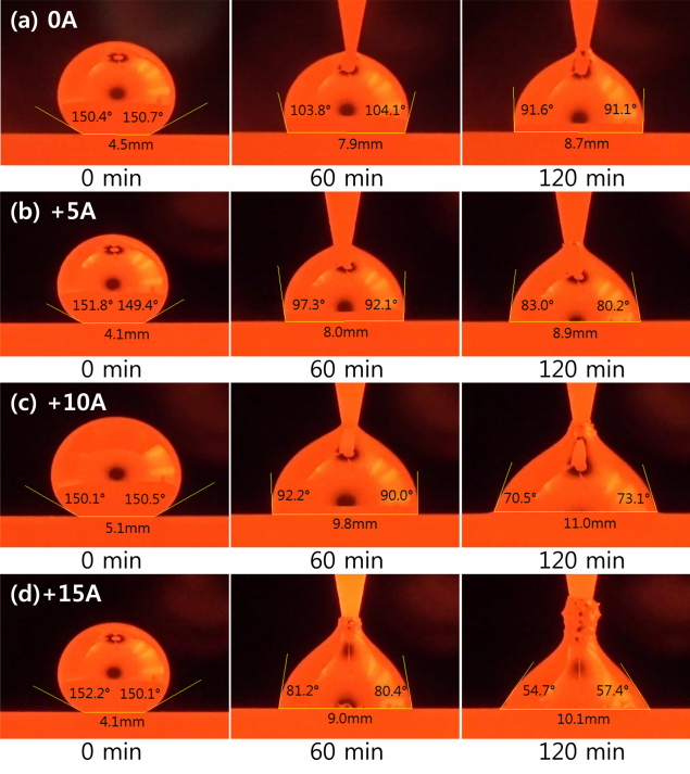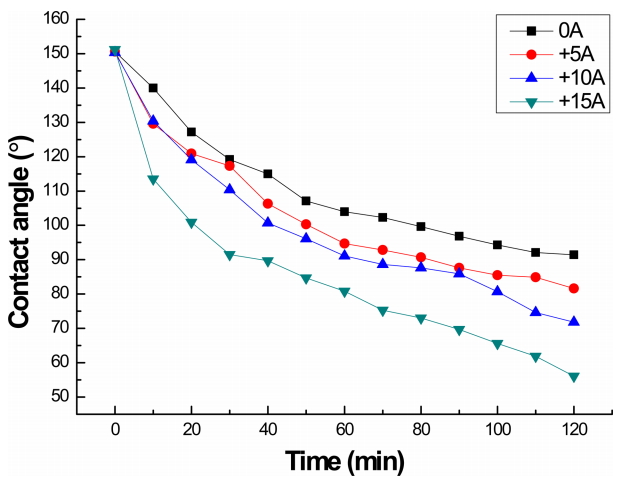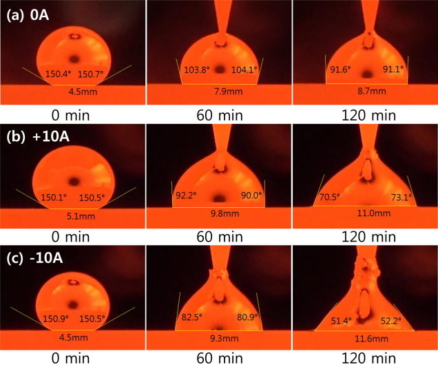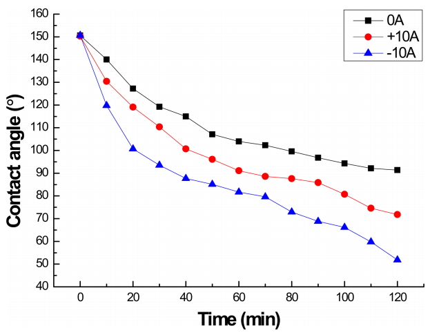 of current (+10A and -10A) is shown in Fig. 5. The contact angle is considerably reduced with heating time in the case of an applied