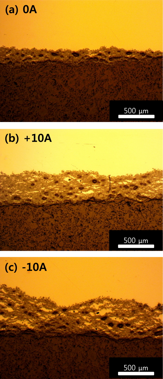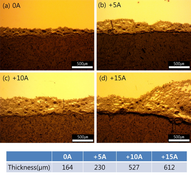 be found that the thickness of the product, which was analyzed as Al4C3 using EPMA, increases with applied current.