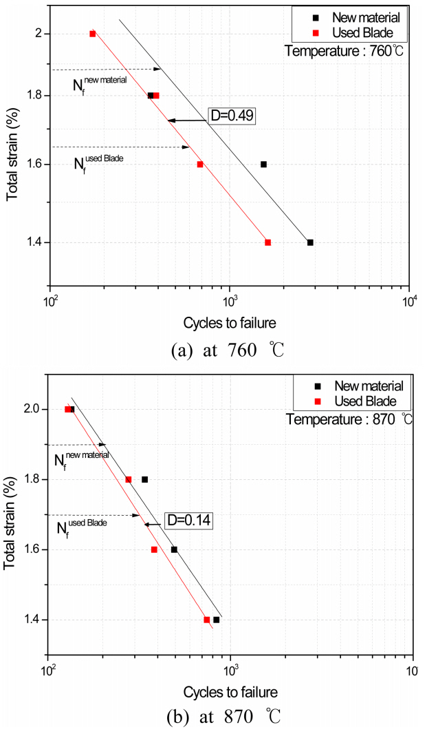 감소하지만 760 °C에서의 손상도는 0.49, 870 °C에서의 손상도는 0.14로 신재와 장시간 사용된 소재의 피로수명의 차이는 감소한다. 따라서