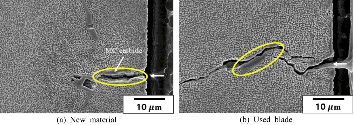 운전된 블레이드에서 시편을 채취하여 각 소재의 미세구조를 비교하고, 그에 따른 손상도를 평가하였다. 시험 후 시편은 SEM을 통해 균열 경로와 파단면의