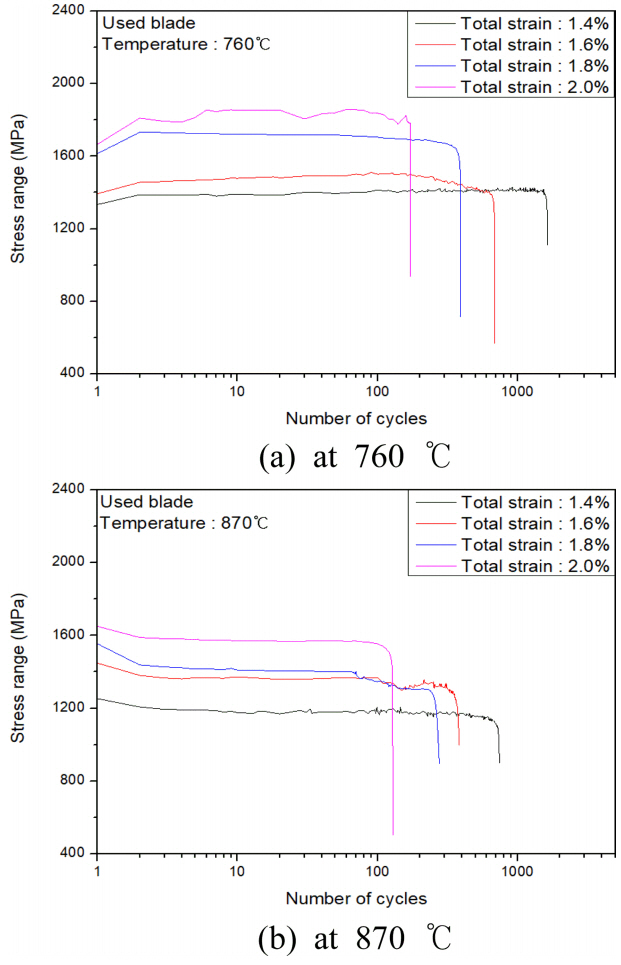 신재와 장시간 사용된 소재의 피로수명 차이가 작음을 의미한다. 피로 수명 시험 결과로 온도는 760 °C에서 870 °C로 증가함에 따라 피로수명은