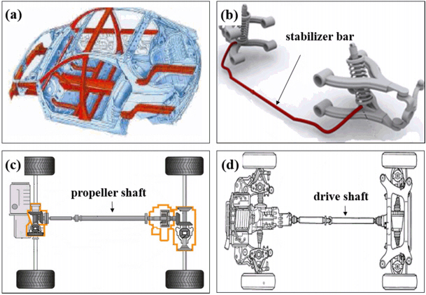 Application of advanced high-strength steels to (a) body frame [4] and ((b), (c), and (d)) various chassis parts in a car [5,6].